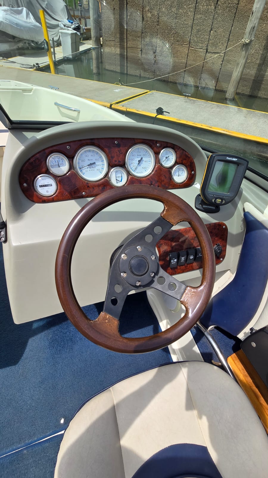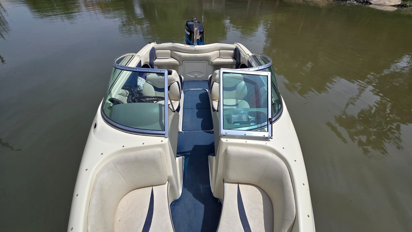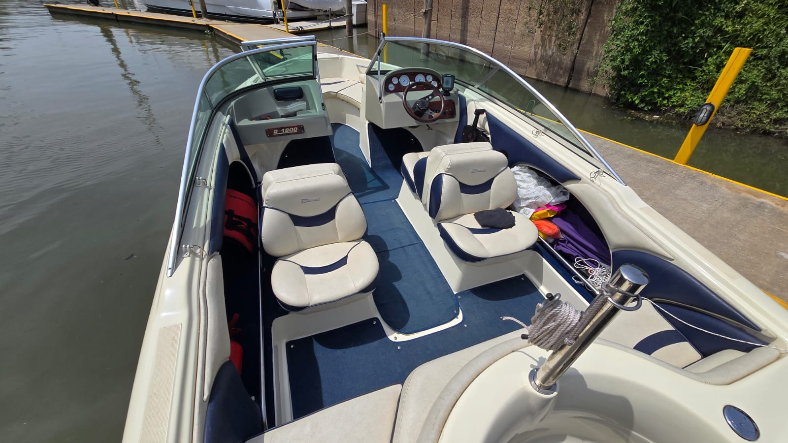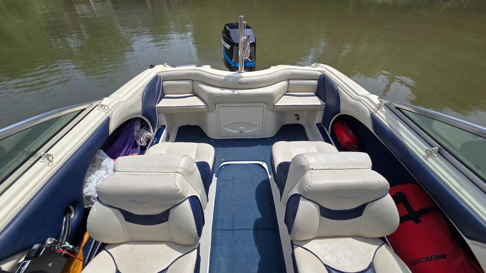 Lona, escalera, alfombras desmontables, corta corrientes, bomba de achique, audio, ecosonda, barra de ski, toldilla.